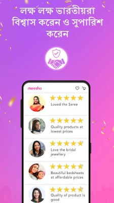 মীশো আপনার অনলাইন কেনাকাটার অভিজ্ঞতা এবং রিসেলিং যাত্রাকে সম্পূর্ণ সুরক্ষিত ও মসৃণ করে তোলে। যেকোনো পণ্য পছন্দ না হলে, মীশো-র 7 দিনের সহজ রিটার্ন ও রিফান্ড নীতি আপনার অর্থ ফেরত পাওয়ার নিশ্চয়তা দেয়, কোনো প্রশ্ন ছাড়াই। এছাড়াও, আপনার সকল অনলাইন লেনদেন এবং পেমেন্টের তথ্য সম্পূর্ণ নিরাপদ থাকে। রিসেলারদের জন্য, কমিশন নিয়মিত বিরতিতে, মাসে তিনবার, স্বয়ংক্রিয়ভাবে ব্যাংক অ্যাকাউন্টে জমা হয়। মীশো-র সাথে আত্মবিশ্বাসের সাথে কেনাকাটা করুন এবং নিজের ব্যবসা গড়ে তুলুন।